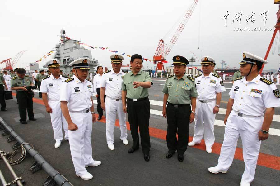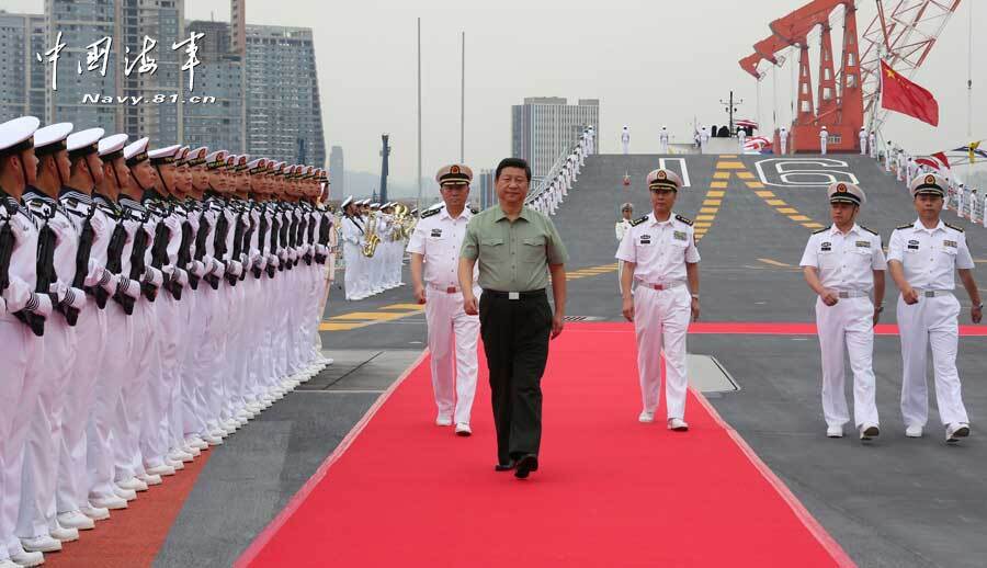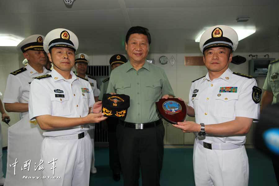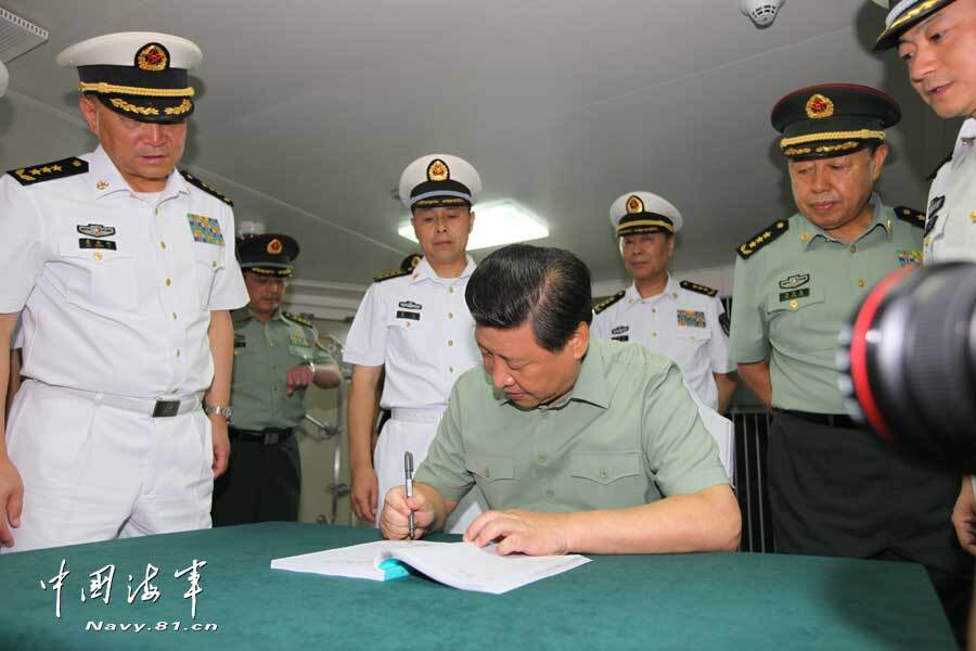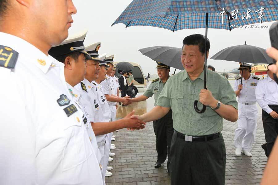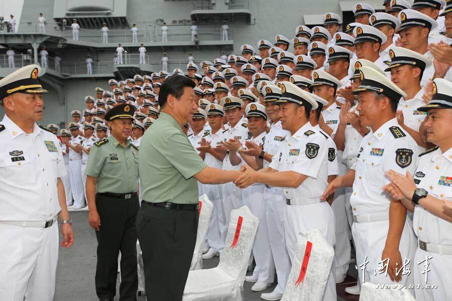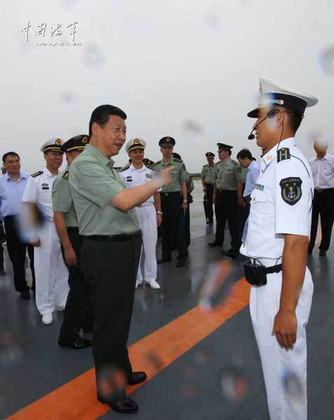 当天下午,习近平又风雨兼程赶往大连,登上停泊在大连港的辽宁舰。军旗迎风飘扬,水兵整齐列队,辽宁舰迎来了一个庄严光荣的时刻。习近平检阅了水兵仪仗队,随后攀舷梯、下机库,深入舱室战位,察看舰上装备设施,询问技战术性能,了解官兵工作训练情况。习近平十分关心舰上官兵后勤保障情况,住宿、饮食、看病等,他问得很详细。习近平接受了水兵们精心准备的舰徽、舰帽,郑重在航泊日志上签名。离别时,习近平登上舷梯,向水兵们深情挥手,他叮嘱辽宁舰舰长和政委,你们要牢记职责,不辱使命,早日形成战斗力和保障力,为建设强大的人民海军作贡献。