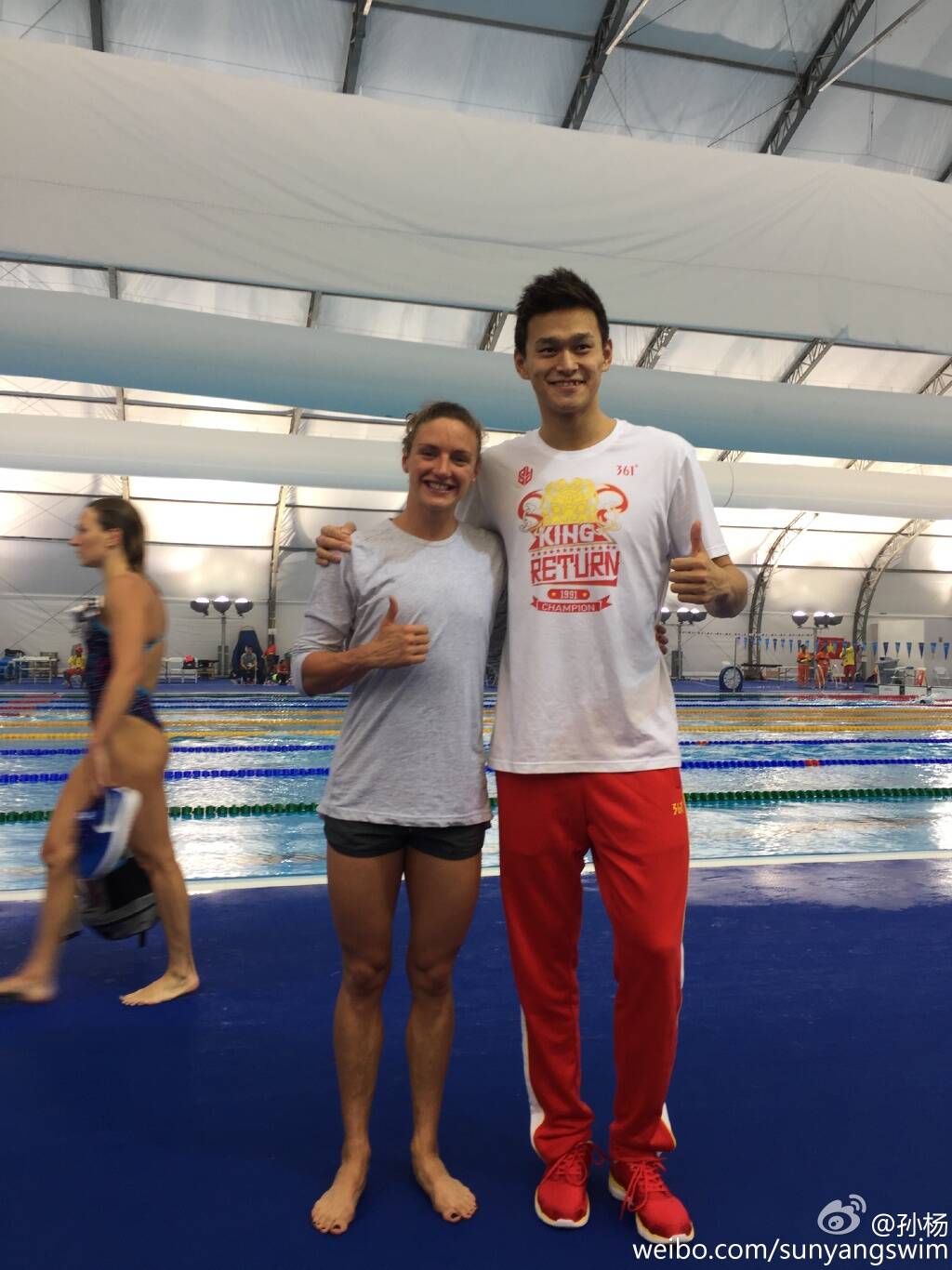 孙杨和澳大利亚游泳美少女坎贝尔合影,大白杨面对镜头笑的非常开心。