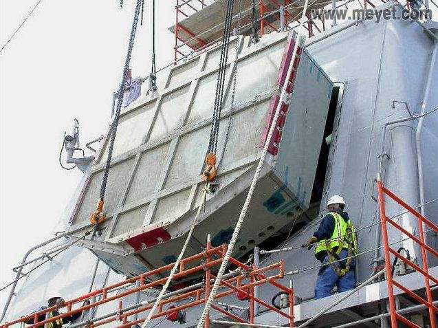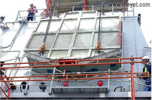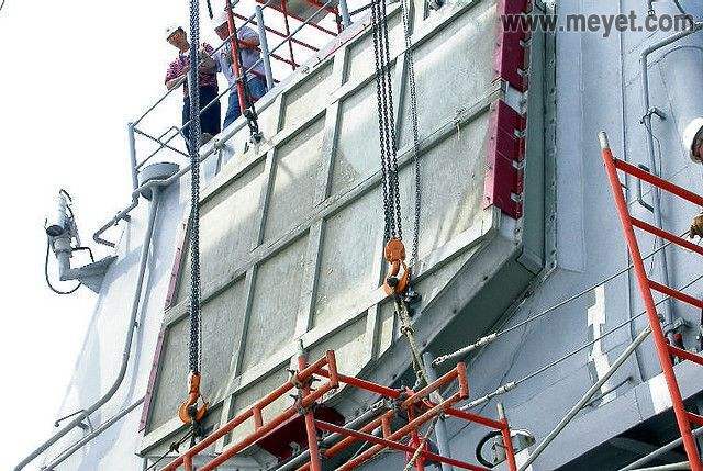 图为美国“提康德罗加”级导弹巡洋舰在改装时安装相控阵雷达的过程,002型航母的雷达安装过程与之相似,在安装过程中,雷达模块安装并不困难,更大的工作量在日后的雷达调整与系统调试。