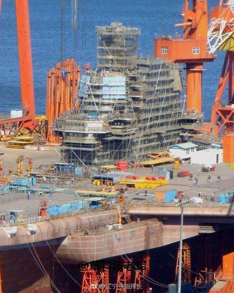 近日网上曝光图片显示,正在大连建造的首艘国产航母——002型航母已开始安装相控阵雷达,于此同时该舰在左舷前部武器区已安装红旗-10近程防空导弹。此前002型航母舰岛的雷达安装部位一直被保护材料遮盖,此时保护材料已经撤去露出里面的空洞结构,一旁的起重机疑似正在吊装相控阵雷达模块,按照一般安装规律,雷达安装通常会在1至2天内全部完成。船台建造阶段,舰岛相控阵雷达安装位置被保护材料遮盖。